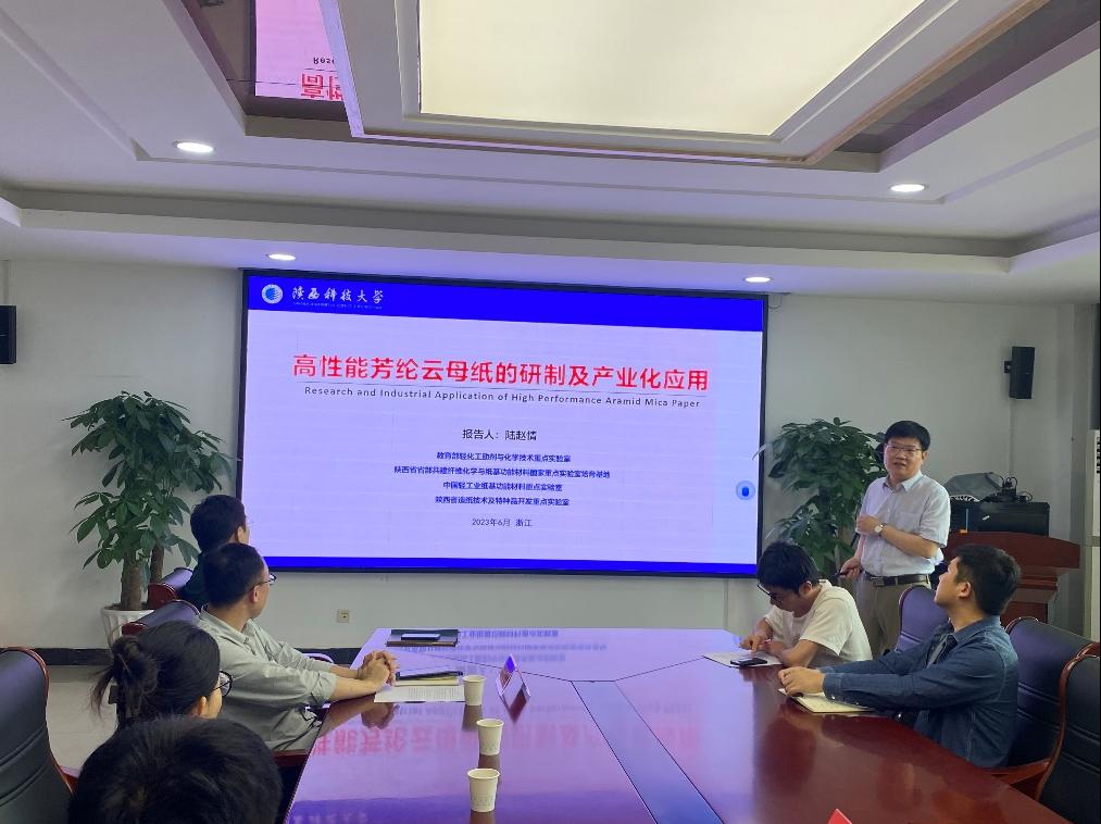 随后,陆赵情教授为师生作了题为《高性能芳纶云母纸的研制及产业化应用》的学术报告。首先介绍了陕西科技大学轻工技术与工程学科的发展历史。结合轨道机车的发展历程阐述了芳纶绝缘产品的发展,在此基础上创新性提出了芳纶云母绝缘纸简单、高效制备技术及结构调控方法。围绕化学纤维/无机粉体混杂浆料分散与湿法成形相关理论和问题,对芳纶云母纸的浆料预处理、浆料高效分散、纸张成形、表界面增强等关键环节展开探讨。(天美传媒