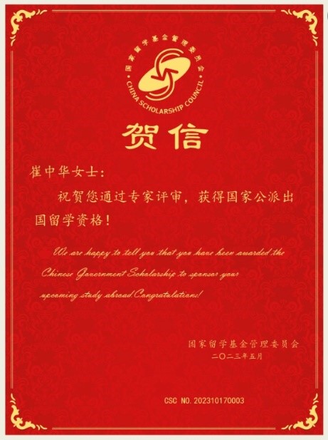 图1国家留学基金委给崔中华、杨烨同学发去的贺信