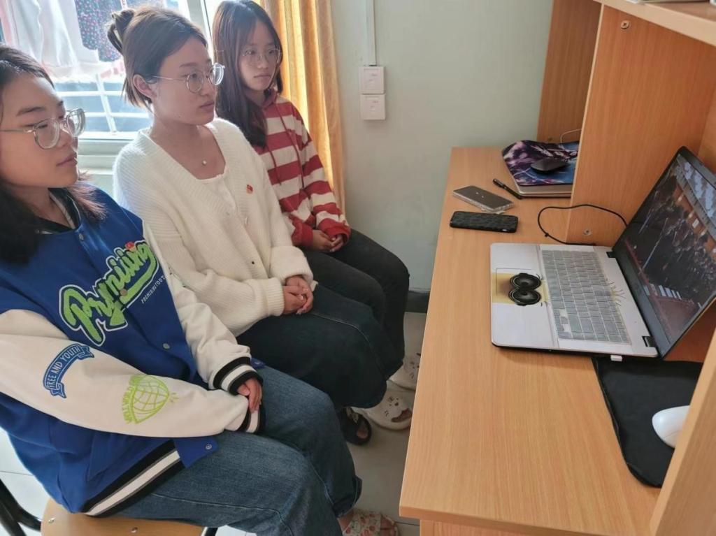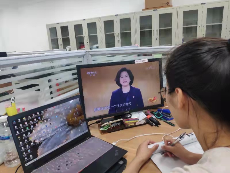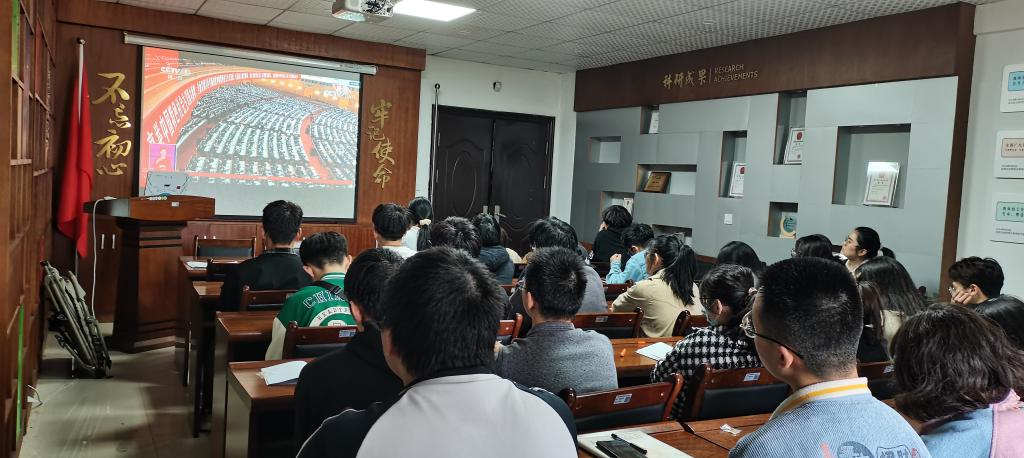 党总支组织师生党员在党员之家、实验室、会议室等地集中收看大会盛况,各支部组织所属党员在各自岗位和寝室同步收听收看。