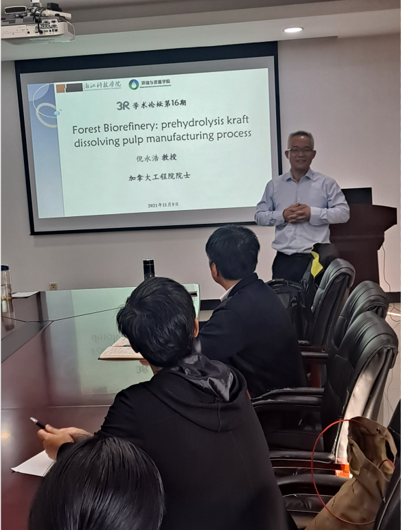 并为第16期“3R”论坛做题为“Forest Biorefinery: prehydrolysis kraft dissolving pulp manufacturing process”的学术报告,刘赫扬院长、胡志军副院长、张进副院长、学院专业教师以及研究生等四十余人参加报告会。