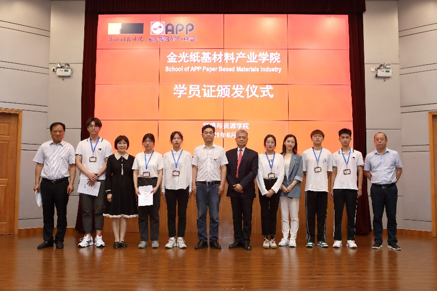 书记李俊为企业导师颁发兼职教师聘书。苗文峰经理现场与学生签订学生培养协议,与会领导为学生颁发金光纸基材料产业学院特色班学员证。