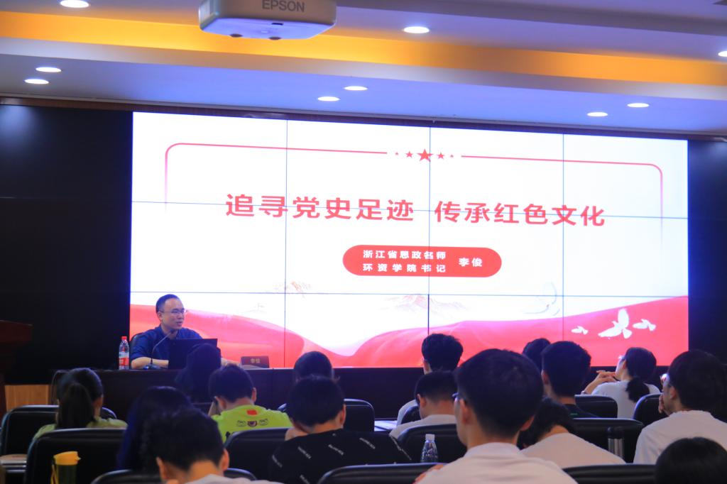 党总支书记李俊以《追寻党史足迹·传承红色文化》为主题,以中国共产党辉煌历程上的五个阶段为主要脉络,带领同学们开展了一场红色文化纪念地之旅,一起探寻井冈山、延安、上海、遵义、嘉兴、西柏坡等地的党史足迹,他希望广大青年学习革命精神,铭记革命历史,传承红色文化,牢记革命先辈为中国革命事业付出的鲜血和生命。