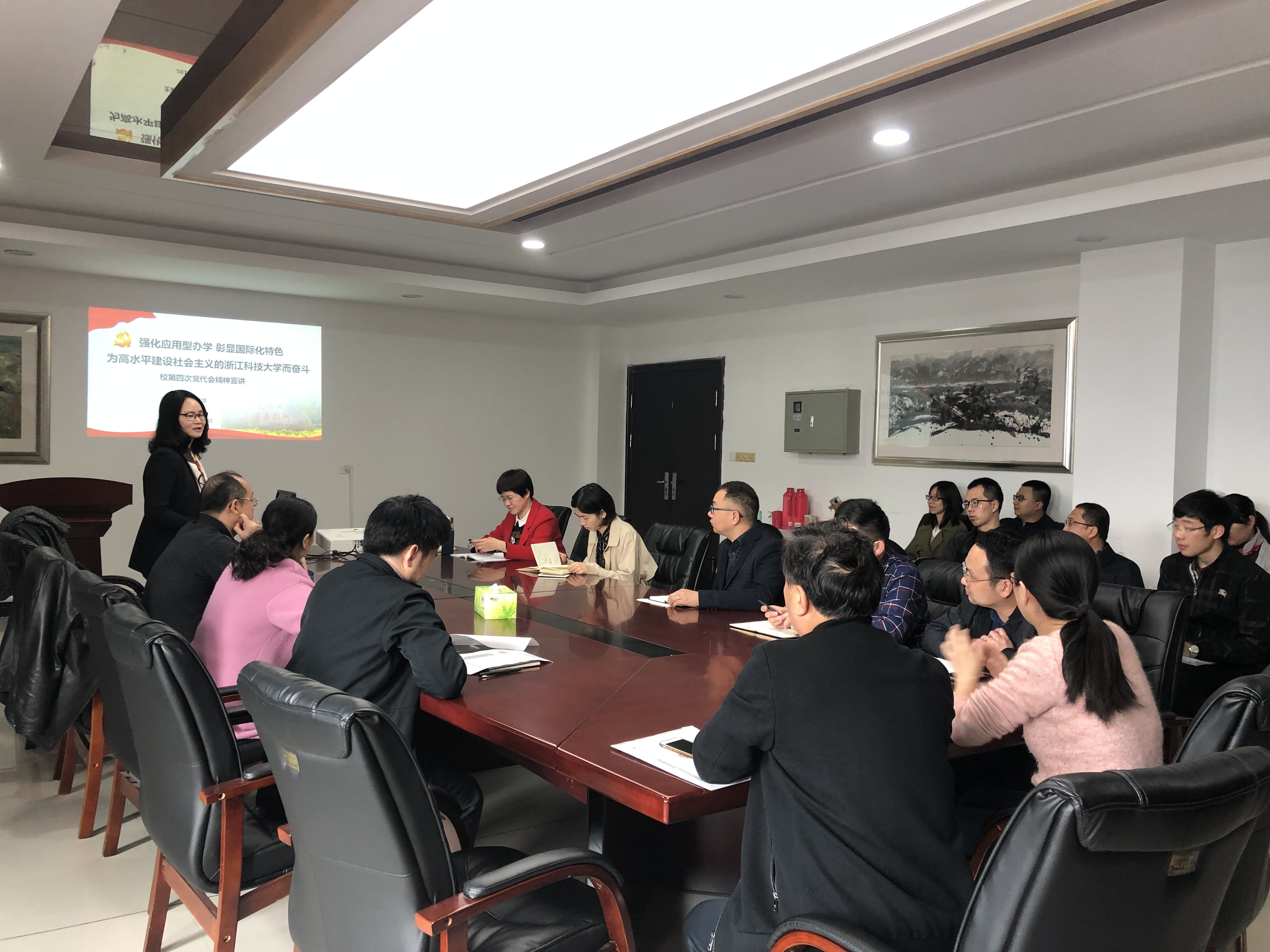 党总支有幸邀请到校纪委陆爱华书记来院带领大家学习校第四次党代会报告。学院党政班子全体成员、中层干部及部分教师参加学习。