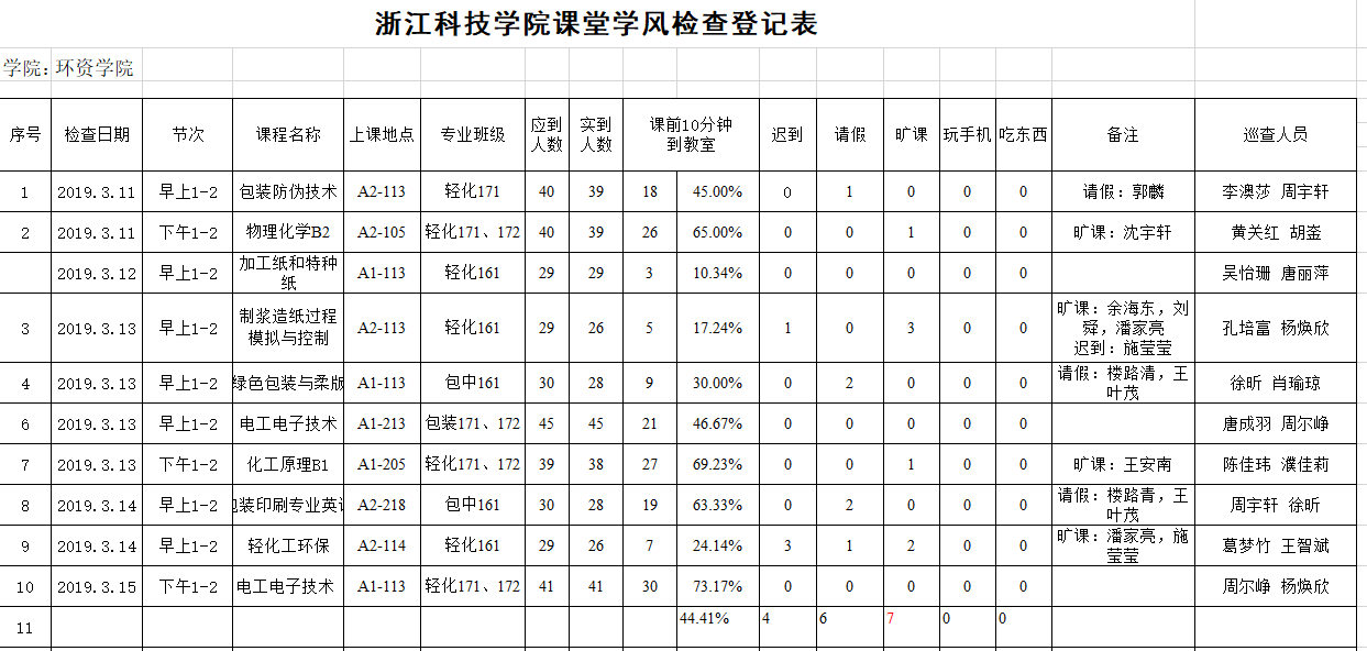 课前10分钟到教室率有较大幅度提高,由30%提升至44%,无课堂吃东西、玩手机现象。包中161班、轻化171、172班到课情况相对较好,轻化161班迟到旷课情况仍相对较为严重。对于旷课同学,希望班主任和导师多关心,查找原因,帮助学生克服困难。
