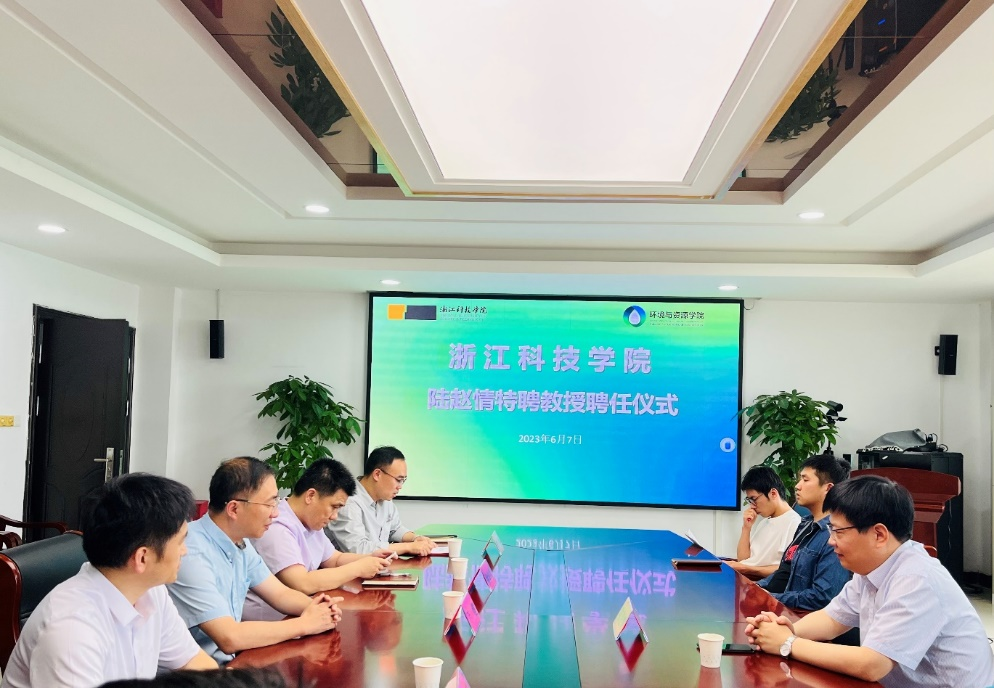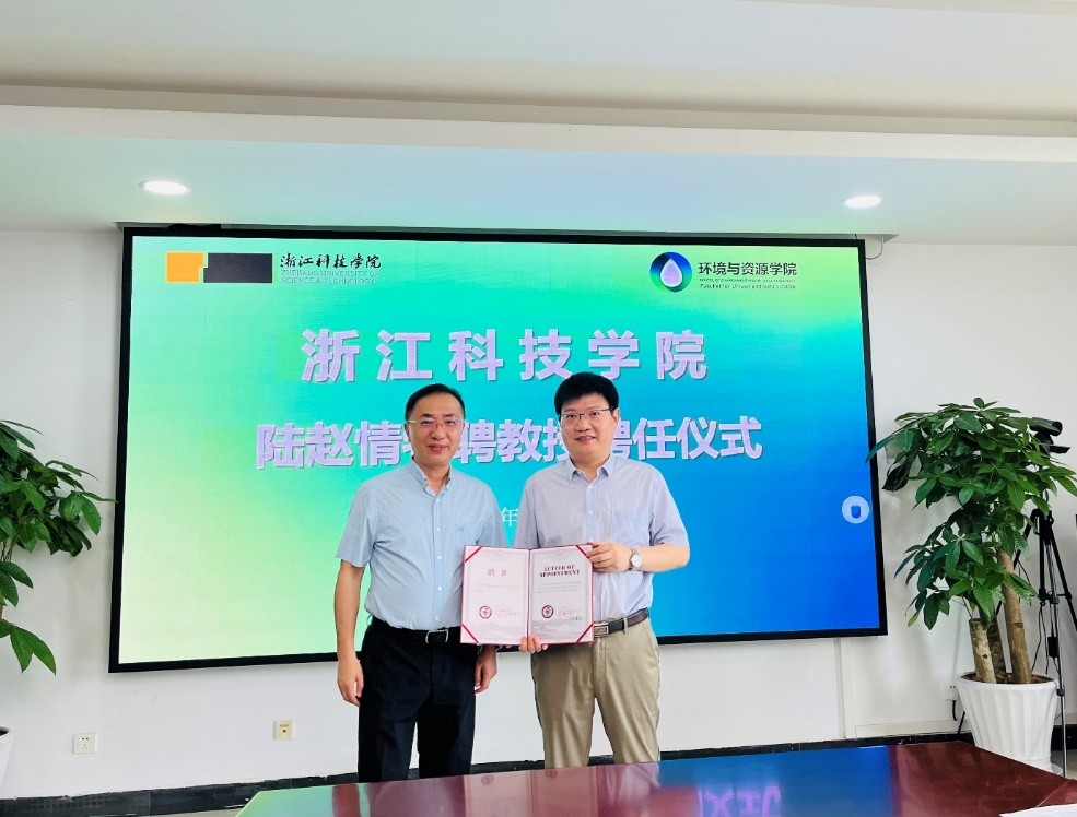 万健为陆赵情教授颁发特聘教授证书,对陆教授受聘浙江科技学院特聘教授表示欢迎,同时希望陆教授对学校发展和轻工技术与工程学科建设给予更多的指导。