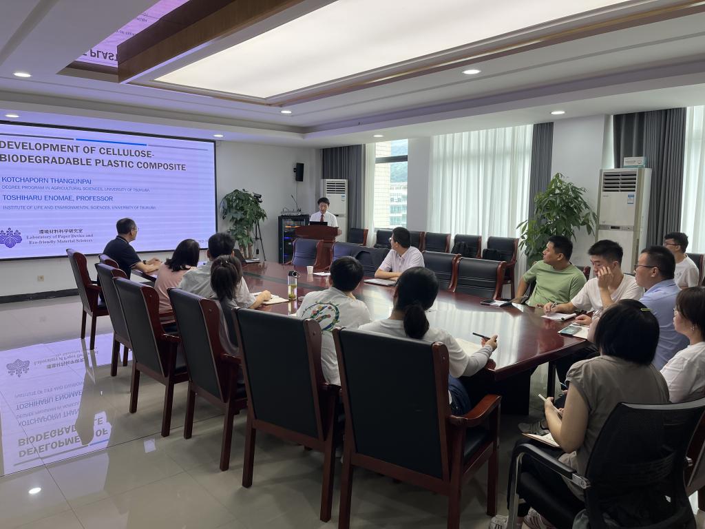 洽谈国际交流合作并作题为“Development of Cellulose-Biodegradable Plastic Composite”的学术报告。会议由学院副院长胡志军主持,学院院长刘赫扬、轻化工程系教师、研究生、本科生等30余人参加了会议。