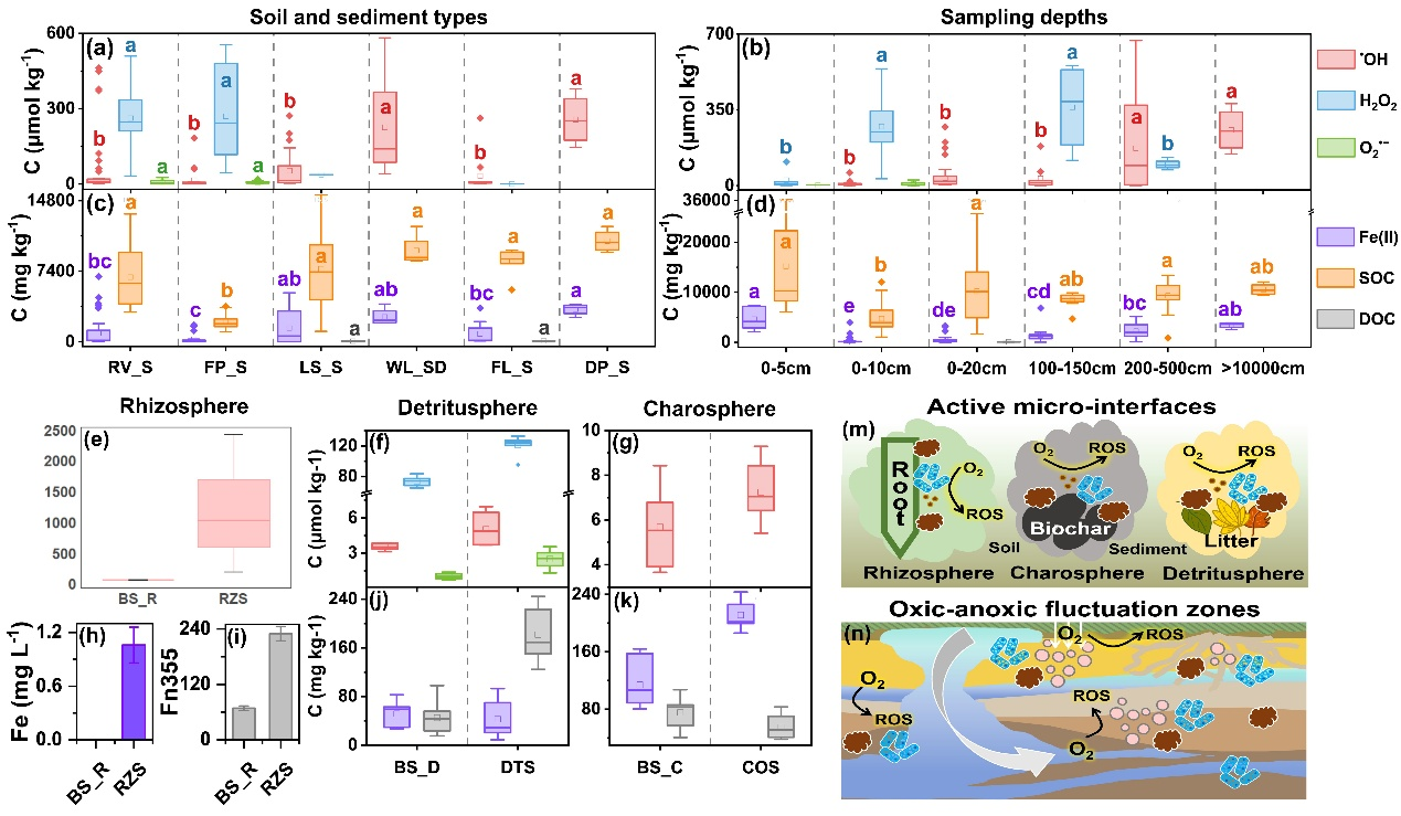 研究背景聚焦于传统活性氧(ROS)研究的局限性。既往综述多强调ROS的毒性和芬顿化学机制,缺乏对土壤/沉积物中ROS空间分布规律、多组分协同形成机制及生态效应的系统性整合。ROS(如超氧自由基O₂•⁻、过氧化氢H₂O₂、羟基自由基•OH和单线态氧¹O₂)作为环境中的关键活性组分,通过驱动碳氮循环、污染物转化和微生物群落演替深刻影响生态系统功能。然而,其分布异质性(如根际、炭际等微界面)和动态生成机制尚未明晰,制约了土壤碳封存与自然修复潜力的挖掘。