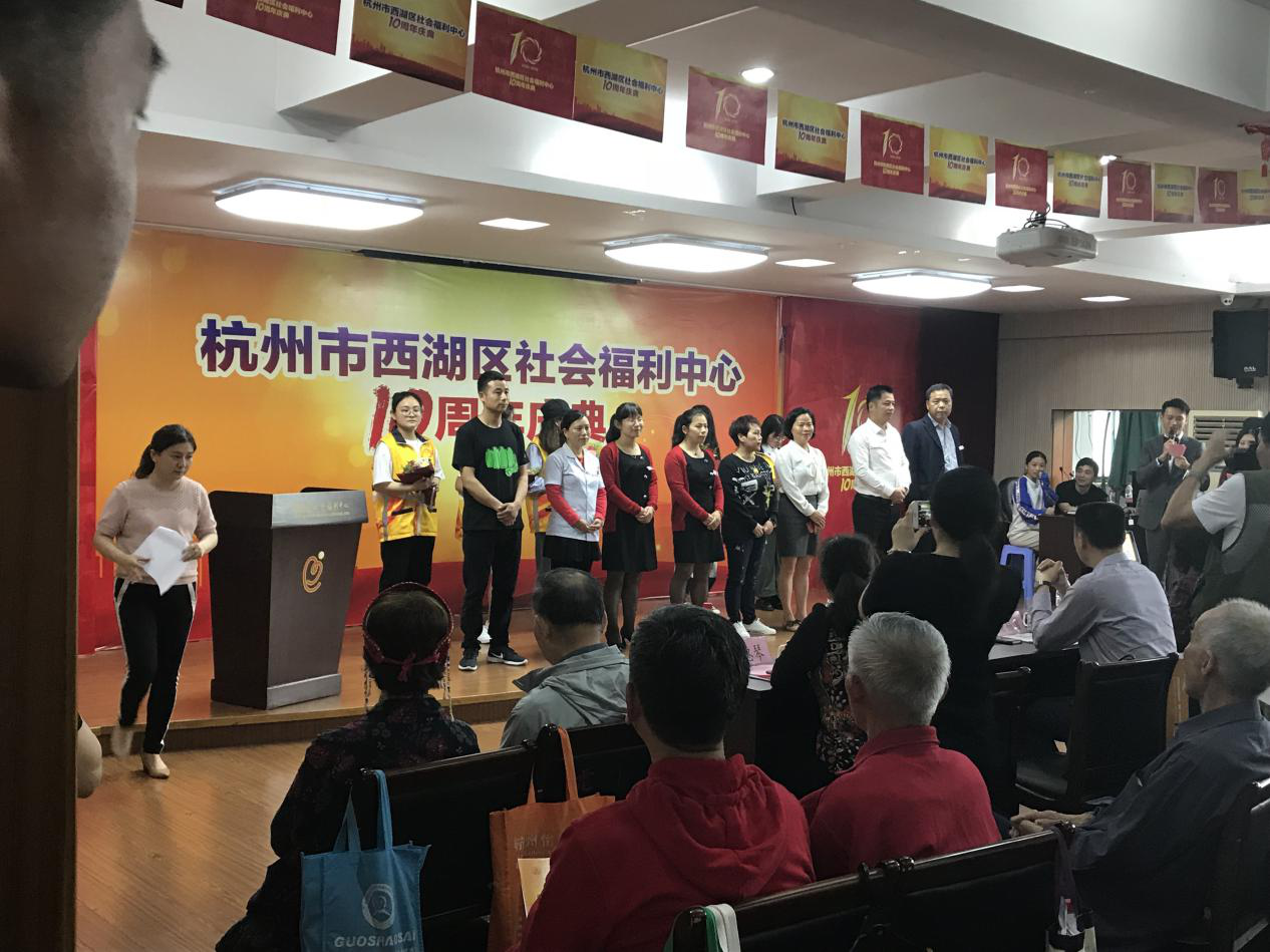 4月24日,正值杭州市西湖区社会福利中心成立十周年庆典,环资志愿者协会10名志愿者再次来到了这里,又见到了可爱的爷爷奶奶们,同时为十周年庆典付出了自己的一份力量