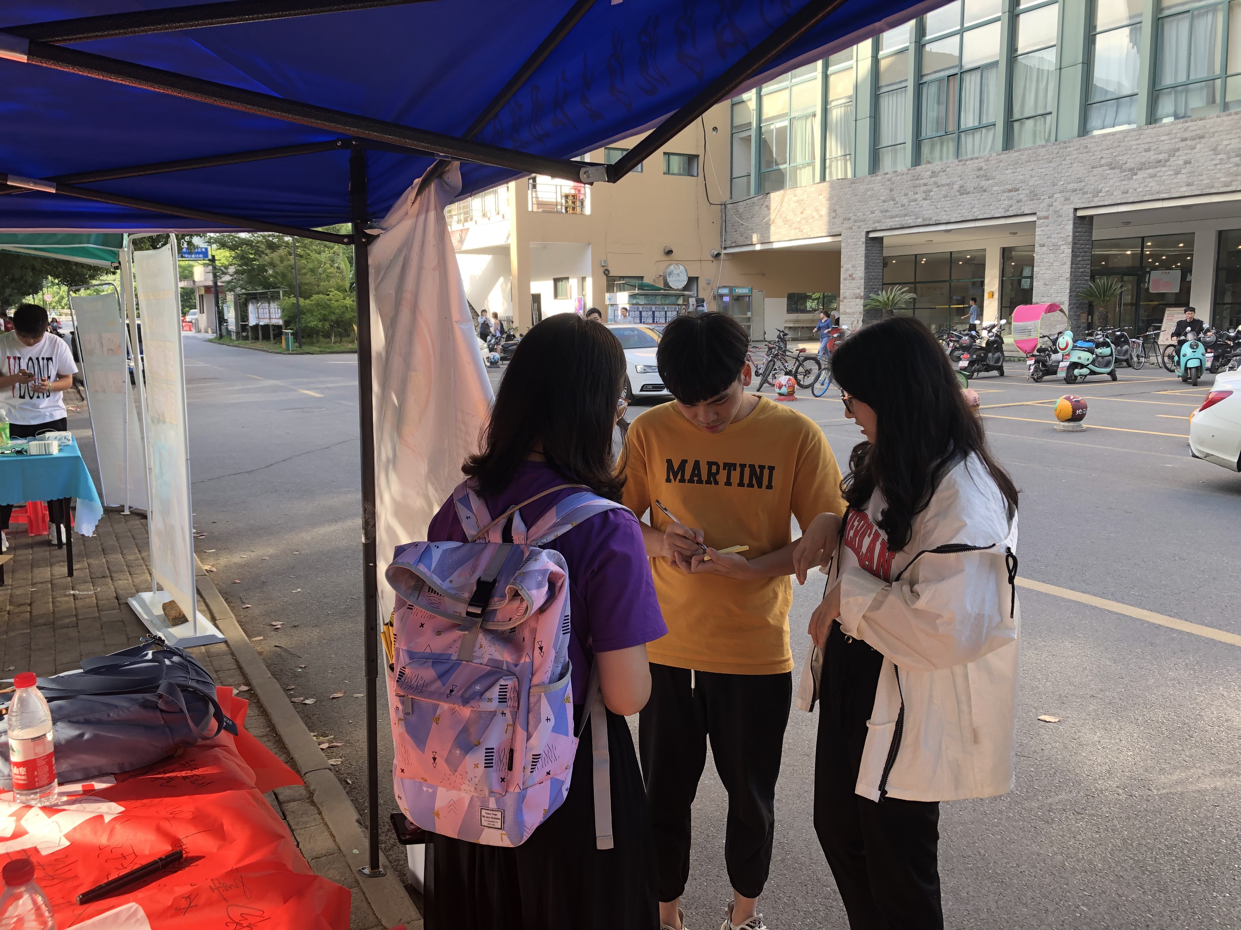 烈日当头,即使下午气温较高,天气较热,环境协会的成员们依旧热情高涨,活动如火如荼的进行着。直至下午5点半,6米长的横幅上已签了一百多个名字,建议板上也有近50份“情况反馈”。最后,参与活动的协会成员在”成果“前留影纪念,记录下这个有意义的时刻,记录下这个不一样的“5·2·1”。